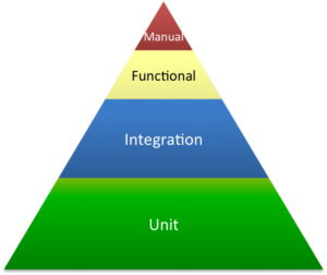 Let’s imagine that instead of operating on data in memory, the service is connected to a sqlite database. This is the basis, if not the extent, of production microservices that I have actually built (though not for pet stores). The service gets built then it’s time to write tests. Here’s the testing pyramid one might reference: