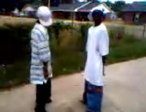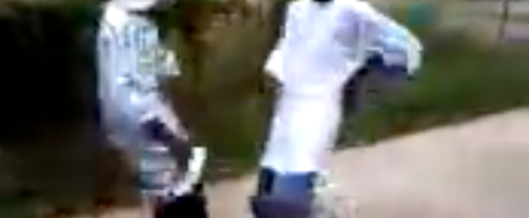 After a few more thrusts and shoulder swings, both Soulja and Arab stop in place and allow suspense to build. The dancer on the left, who is likely Arab, takes this time to fasten his pants. After several seconds, in which Arab’s body language suggests he is finished dancing, the fellow on the right, likely Soulja Boy, begins cranking it aggressively, exhibiting a clean performance of the “Roosevelt” routine. He draws a “whatthefuck–” from the cameraman as Arab thrusts once more.